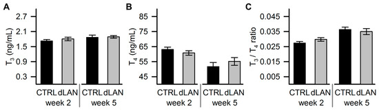 Next, we analyzed circulating levels of thyroid hormones, which are known to regulate metabolic pathways in the liver and adipose tissue [36]. Moreover, the hypothalamic–pituitary–thyroid axis is under circadian control, and disturbed lighting conditions have been shown to alter thyroid hormone levels [37]. However, we found no differences in plasma levels of triiodothyronine (T3), thyroxine (T4), and the T3/T4 ratio between CTRL and dLAN-exposed rats (Figure 4A–C), indicating that thyroid hormones were not primarily involved in metabolic effects caused by dLAN.