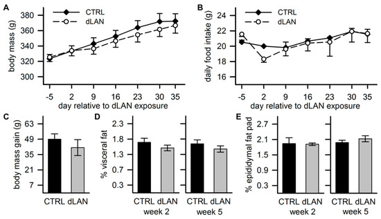 Previous studies in Swiss-Webster mice reported that dLAN exposure can lead to increased body mass [26], but this affect was not found in rats [15,16]. In our study, body mass increased over the 5 weeks of the experiment, but no differences between CTRL and dLAN-exposed rats were recorded, either in body mass (Figure 5A) or total body mass gain (Figure 5C). These findings were in line with daily food intake changes over the experiment, which did not differ between CTRL and dLAN-exposed rats (Figure 5B). Moreover, 2 and 5 weeks of dLAN did not affect the percentage of visceral fat (Figure 5D) and epididymal fat pad mass (Figure 5E). Therefore, dLAN-induced changes in metabolic homeostasis were probably independent of changes in body mass and total food intake.
