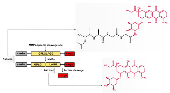 One of the strategies to increase therapeutic efficiency, with high binding specificity and reduced toxic effects of a drug, is to conjugate it with polymers, lipid nanoparticles, or antibody–drug conjugates [14,15,16]. Such an approach can lead to a system characterized by enhanced solubility, permeability, and retention in body plasma that triggers drug release in cancer cells [17]. A variety of polymers, including polymer–drug conjugates (PDCs), polymer–protein/peptide, polymer–DNA, and their hybrids, have been developed in the past decades as selective therapeutic agents. Several examples of PDCs have been observed to couple a hydrophobic drug with hydrophilic polymers such as poly(lactic-co-glycolic acid) (PLGA) and poly(ethylene glycol) (PEG) [18,19]. However, PDCs with increased stability, solubility, and lower toxicity would not be suitable for cancer therapy if they did not release an anticancer component at the target place. To overcome this problem, PDCs release a drug using a peptide fragment selectively cleaved by enzymes, or under specific conditions [20]. Matrix metalloproteinases (MMPs) are a group of over 20 proteolytic enzymes characterized by their ability to remodel and degrade the extracellular matrix [21]. MMPs are overexpressed in newly formed tumor tissues, thereby promoting angiogenesis, and are involved in cancer progression; MMP-2 and MMP-9, in particular, play a critical role in this process [22,23]. Therefore, MMPs could constitute a promising strategy for targeted therapeutic agent delivery via an enzyme-triggered release mechanism [24]. According to the literature, there are a series of substrate peptide sequences degradable in the presence of MMPs, e.g., Gly–Pro–Leu–Gly–Ile–Ala–Gly–Gln, Pro–Val–Gly–Leu–Ile–Gly, or Pro–Leu–Gly–Val–Arg, where cleavage occurs between leucine (Leu) and glycine (Gly) [25,26,27]. Using this approach, new polymer–drug conjugates with a selective peptide sequence between the carrier (polymer) and the cargo (drug) have been designed [28]. The drug release from enzymatically cleavable prodrugs occurs within a two-step mechanism: (1) a prodrug is cleaved by MMPs and is (2) further cleaved or hydrolyzed to the desired drug [29]. Hence, some reports suggest that additional proteases are important for liberating a free drug from intermediate cleavage products [30].