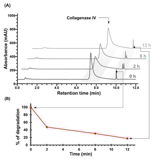 (A) HPLC chromatograms of the MMP-2/-9-cleavable peptide after 2, 8, and 12 h of incubation with collagenase IV. (B) The curves depicting the efficacy of enzymatic cleavage, triggered in a time-dependent manner.