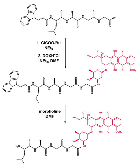 Isobutyl chloroformate (9.6 µL, 74.3 µmol) and TEA (10.4 µL, 74.3 µmol) were added to the solution of Fmoc–Leu–Ala–Gly–Gly (40 mg, 74.3 µmol) in DMF (1 mL) cooled to −10 °C. After 20 min of vigorous stirring, a solution of DOX (obtained by treating DOX hydrochloride (43 mg, 74.3 µmol) in DMF with TEA (10.4 µL, 74.3 µmol)) in DMF (0.5 mL) was added to the reaction mixture. After 1 h at RT, DMF was evaporated, azeotropically, with toluene on a rotary evaporator (Heidolph Hei-VAP Gold 3, Heidolph, Schwabach, Germany). The raw Fmoc–Leu–Ala–Gly–Gly–DOX was purified by preparative column chromatography, using CHCl3: MeOH 30: 1 as an eluent, to give the desired product (59 mg) in a 75% yield.