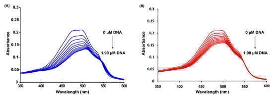 The concentrations of the studied compounds (DOX and 4-pep–DOX) were confirmed spectrophotometrically based on the absorbance and the value of the molar extinction coefficient determined at 480 nm (ε480 = 11500 M−1 cm−1) [44]. UV-Vis spectrophotometric experiments were carried out in 10 mM Tris-HCl buffer (pH 7.2) at 25 °C using a PerkinElmer Lambda 650 UV/Vis spectrophotometer (Walthnam, MA, USA). UV-Vis absorption spectra of DOX and 4-pep–DOX (18.0 µM) were recorded in the absence and presence of increasing concentrations of dsDNA, up to 1.90 µM. In the performed spectrophotometric experiments, 2 mL of DOX and 4-pep–DOX at 18.0 µM were titrated with ten 10 μL aliquots of dsDNA solution at 40 µM.