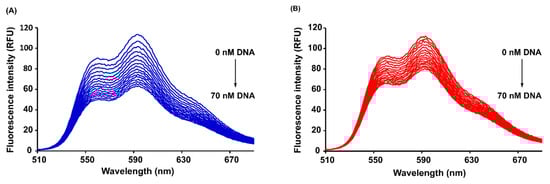 Fluorescence emission spectra of DOX (A) and 4-pep–DOX (B) in the presence of dsDNA at various concentrations in 10 mM Tris-HCl buffer (pH 7.2) at 25 °C (the initial concentration of DOX and 4-pep–DOX = 1.94 µM).