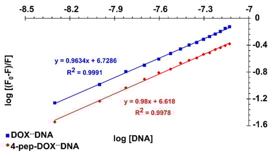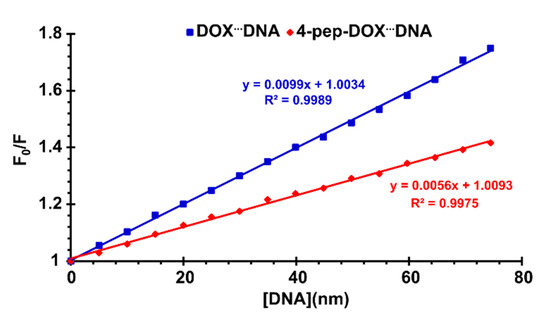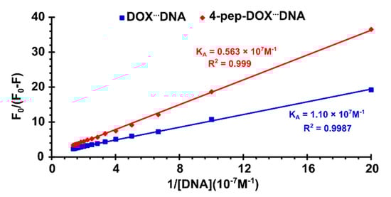 Plots of vs. for the DOX…dsDNA and 4-pep–DOX…dsDNA systems in 10 mM Tris-HCl buffer (pH 7.2) at 25 °C.