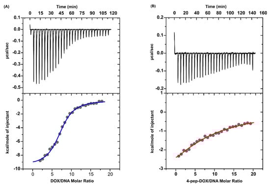 Calorimetric titration isotherms of the binding interaction between (A) DOX and dsDNA and between (B) 4-pep–DOX and dsDNA in 10 mM Tris-HCl buffer (pH 7.2, 25 °C).