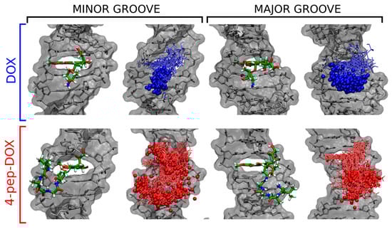 Figure 11 shows, separately, the most likely structures of DOX…dsDNA and 4-pep–DOX…dsDNA complexes identified by our cluster analysis for each of the four intercalation cases considered. As expected, the energetically most favorable DOX…dsDNA complex in the minor-groove mode is characterized by a well-defined structure with one preferred arrangement of the ligand with respect to the dsDNA duplex (85% of the bound ensemble). This is also manifested by the limited structural fluctuations of the ligand within the intercalation site, and by strong interactions between the positively charged amino group of DOX with dsDNA phosphate groups, with the mean distance to the closest phosphate being 0.62 nm. By comparison, intercalation of DOX from the major-groove side does not allow for a favorable electrostatic contact between the amino group and the dsDNA backbone (the mean distance to the closest phosphate is 1.06 nm), resulting in a substantially reduced stability of the complex.