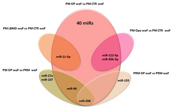 Venn diagram summarizes all the miRs identified as possible biomarkers for LBMD. PM: post-menopause; OP: osteoporosis; PRM: pre-menopause; LBMD: low bone mass density; CTR: control; woF: without fracture.