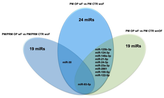None of the three selected miRs (miR-26a-5p, miR-34a-5p, and miR-223-5p) by Pickering et al. [67] showed significant differences in the serum of PM OP wF patients when compared to woF PM CTRs.