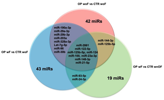 Ramírez-Salazar et al. also detected higher levels of miR-23a-3p and miR-140-3p in the serum of 21 OP wF with respect to 22 CTRs by [52]. (Further details have been reported in the previous Section 3.1.1).