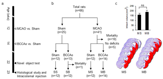 (a) The time line of the experiment. (b) Allocation of rats into groups. (c) Quantification of the infarct volume and representative images of cresyl violet staining in MS and MB rats. n = 6 in both groups; MCAO, middle cerebral artery occlusion; BCCAo, bilateral common carotid artery occlusion; SS, sham + sham; SB, sham + BCCAo; MS, MCAO + sham; MB, MCAO + BCCAo; ns, not significant.