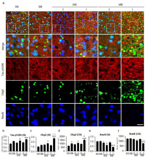 Tauopathy in the cortex. (a) Triple-label immunohistochemistry of tau hyperphosphorylation at the serine 396 residue (Tau pS396) in conjunction with oligodendrocytes (Olig2) and neurons (NeuN). Quantitative analysis of the signal intensities of Tau pS396 (b), the signal intensities of Olig2 (c), the number of Olig2-positive cells (d), the signal intensities of NeuN (e), and the number of NeuN-positive cells (f). n = 6 per group; scale bar = 20 μm; SS, sham + sham; SB, sham + BCCAo; MS, MCAO + sham; MB, MCAO + BCCAo; MCAO, middle cerebral artery occlusion; BCCAo, bilateral common carotid artery occlusion; c, contralateral; i, ipsilateral; SI, signal intensity; CN, cell number; * p < 0.05 and *** p < 0.001 compared to SS; # p < 0.05 and ### p < 0.001 compared to the ipsilateral MS.