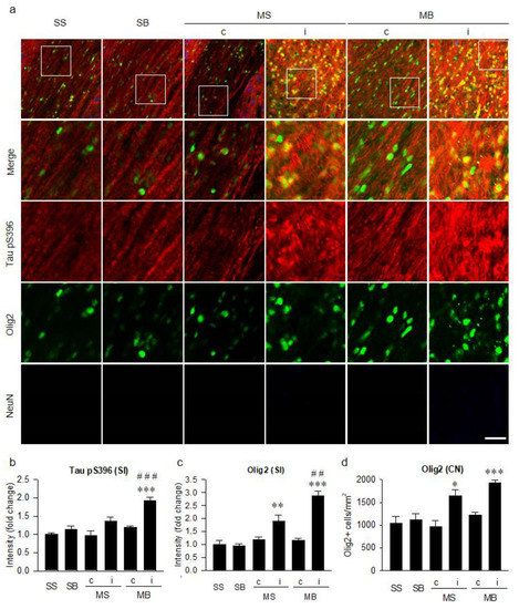 Tau hyperphosphorylation at Ser396 in the corpus callosum (Figure 4a) was significantly different among groups (F(5,30) = 13.346, p < 0.001, Figure 4b). On post hoc analysis, the expression of Tau pS396 in the ipsilateral corpus callosum of the MB rats was significantly higher than in the SS rats (p < 0.001, Figure 4b). On post hoc analysis, the expression of Tau pS396 in the ipsilateral corpus callosum of the MB rats was still significantly higher than in the MS rats (p < 0.001, Figure 4b). Signal intensity of Olig2 in the corpus callosum was significantly different among groups (F(5,30) = 23.761, p < 0.001, Figure 4c) as well as in their cell number (F(5,30) = 10.658, p < 0.001, Figure 4d), with a significant enhancement in the ipsilateral corpus callosum of the MS and MB rats compared to the SS rats on post hoc analysis in the signal intensity (p < 0.01 in MS, p < 0.001 in MB, Figure 4c) and in the cell number (p < 0.05 in MS, p < 0.001 in MB, Figure 4d). On post hoc analysis, the expression in the signal intensity of Olig2 in the ipsilateral corpus callosum of the MB rats was still significantly higher than in the MS rats (p < 0.01, Figure 4c). NeuN staining, which was used to detect the soma of the neurons, was not observed in the corpus callosum because of the scarcity of neuronal soma in the white matter (Figure 4a).
