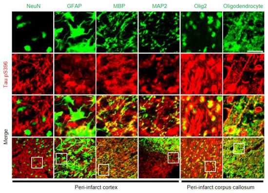 To characterize tauopathy in the peri-infarct area of MB rats, we investigated how Tau pS396 expression was correlated with various structures, such as neurons (NeuN), astrocytes (GFAP), the myelin sheath (MBP), microtubules in the neuronal axon (MAP2), nuclei and soma of oligodendrocytes (Olig2), and the whole oligodendrocyte with dendritic processes (Oligodendrocyte) (Figure 5). Intracellular aggregation of hyperphosphorylated tau was colocalized with neuronal axons and oligodendrocytes, but not with astrocytes. Neuronal axons and their surrounding myelin sheaths, as indicated by anti-MAP2 and anti-MBP, were correlated with signals of tau hyperphosphorylation in the peri-infarct cortex. Normal linear patterns of the axons and their myelin sheaths were disrupted. Colocalization of hyperphosphorylated tau with oligodendrocytes was confirmed by two different antibodies, anti-Olig2 and anti-Oligodendrocytes in the peri-infarct corpus callosum.