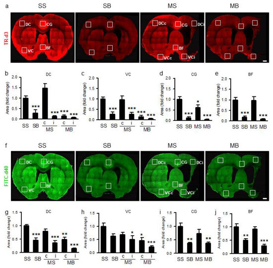 To evaluate glymphatic function indirectly, we investigated parenchymal infiltration of two CSF tracers with different molecular weights. The fluorescent areas of Texas Red®-conjugated dextran (TR-d3) (Figure 6a), reflecting parenchymal infiltration of tracers through the glymphatic system, were significantly different among groups in all selected areas of the cerebral hemisphere (F(5,30) = 2.277, p < 0.001 in the dorsal cortex, DC; F(5,30) = 16.491, p < 0.001 in the ventral cortex, VC; F(3,20) = 23.450, p < 0.001 in the cingulate gyrus, CG; and F(3,20) = 18.543, p < 0.001 in the basal forebrain, BF; Figure 6b–e). On post hoc analysis, compared to the SS rats, the fluorescent areas of TR-d3 in the DC and VC were significantly decreased in all groups except in the contralateral cortex of the MS rats (Figure 6b,c). In the midline structures, the TR-d3 fluorescent areas in the CG were significantly decreased in the SB, MS, and MB rats (Figure 6d), whereas the TR-d3 fluorescent areas in the BF were significantly decreased in the SB and MB rats (Figure 6e). Fluorescein isothiocyanate (FITC)-conjugated dextran (FITC-d40) infiltration (Figure 6f) was also significantly different among groups in all selected areas of the cerebral hemisphere (F(5,30) = 16.283, p < 0.001 in DC; F(5,30) = 6.590, p < 0.001 in VC; F(3,20) = 10.811, p < 0.001 in CG; and F(3,20) = 16.316, p < 0.001 in BF; Figure 6g–j). On post hoc analysis, compared to the SS rats, the fluorescent areas of FITC-d40 in the DC were significantly decreased in all groups except in the contralateral cortex of the MS rats (Figure 6g), whereas the fluorescent areas of FITC-d40 in the VC were significantly decreased in the ipsilateral cortex of the MS rats and the bilateral cortices of the MB rats (Figure 6h). FITC-d40 fluorescent areas in the CG and BF were significantly decreased in the SB and MB rats compared to those in the SS rats (Figure 6i,j).