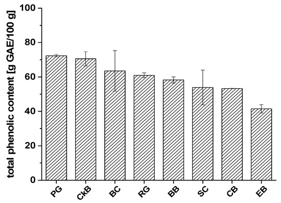 Extracts of PG (72.3 ± 0.7 g GAE/100 g), CkB (70.6 ± 4.1 g GAE/100 g), and BC (63.5 ± 11.7 g GAE/100 g) showed the highest total phenolic contents, followed by RG (61.0 ± 1.4 g GAE/100 g) and BB (58.4 ± 1.8 g GAE/100 g). The lowest total phenolic contents were found in SC (53.9 ± 10.1 g GAE/100 g), CB (53.3 ± 0.1 g GAE/100 g), and EB (41.5 ± 2.4 g GAE/100 g). Most of the fruit extract varieties had mean phenolic content values with small standard deviations; the BC and SC juice extracts were the exceptions. A possible explanation could be that there are significant differences between the types of BC and SC which we studied or that the fruits originated from cultivation regions with different environmental and/or climatic conditions.
