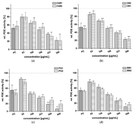 Rel. PDE 3B activities of around 80% were shown by the CkB1 and CkB2 extracts (c = 63 µg/mL); the highest concentrations of these extracts (c = 380 µg/mL) decreased PDE activity to 22.9 ± 2.2% and 21.7 ± 13.5%, respectively, compared to the solvent control (Figure 3a). At the 166 µg/mL concentration, the two CkB extracts showed levels of activity comparable to the PC caffeine (around 50% PDE activity). A similar effect was observed for the two CB extracts (Figure 3b).