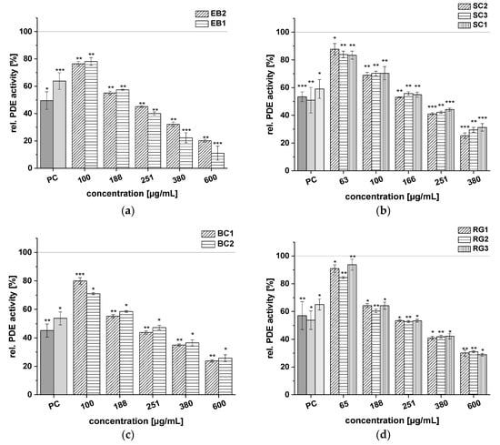 Test results for the following extracts are presented in Figure 4: EB1, EB2, SC1, SC2, SC3, BC1, BC2, RG1, RG2, and RG3. These fruit juice extracts also showed significant, dose-dependent inhibition of PDE activity, but the effects were less pronounced than the extracts from CkB, CB, PG, and BB shown in Figure 3. Extracts EB1 and EB2 both displayed concentration-dependent reduction of PDE enzyme activity (Figure 4a). At the highest concentration tested (c = 600 µg/mL), the EB1 extract was more potent than the EB2 extract, as demonstrated by a lower rel. PDE activity of 11.0 ± 5.2% for EB1 compared to 20.1 ± 1.0% for EB2. The three SC extracts inhibited PDE activity compared to the control, with activity levels ranging between 25.3 ± 2.0% and 31.3 ± 2.7% at a concentration of 380 µg/mL (Figure 4b). The two BC extracts reduced PDE activity significantly at all concentrations tested (c = 100–600 µg/mL), and, at a concentration of 251 µg/mL, the effect of both extracts on PDE activity was comparable to that of caffeine (around 50% PDE activity; Figure 4c). The three RG extracts (RG1, RG2, RG3) showed the weakest impact on PDE 3B activity of all the fruit extracts. Nevertheless, PDE activity after treatment with the RG extracts also diminished in a concentration-dependent manner, and minimum activity of around 30% was observed at the highest concentration tested (600 µg/mL; Figure 4d).