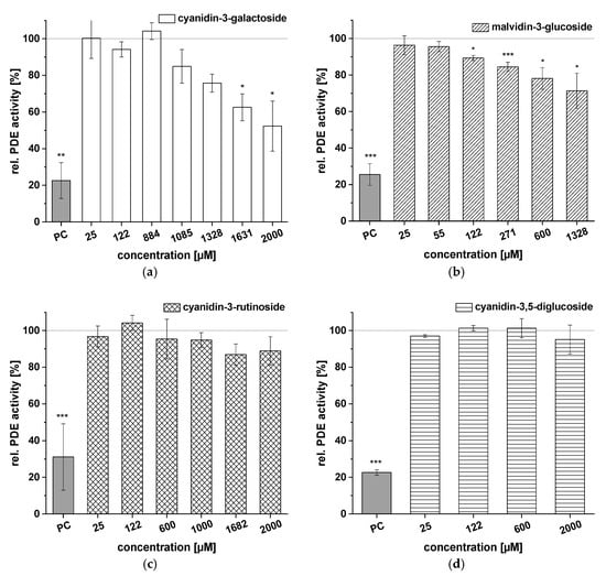 Test results for the ACs cyanidin-3-galactoside, malvidin-3-glucoside, cyanidin-3-rutinoside, and cyanidin-3,5-diglucoside are illustrated in Figure 6. Cyanidin-3-galactoside had no influence on PDE activity at levels below 884 µM (Figure 6a), but effects were observed at higher concentrations (1085–2000 µM; 52.3 ± 13.7% PDE activity; c = 2000 µM). Malvidin-3-glucoside effects on PDE activity were concentration-dependent, with a minimum PDE activity of 71.4 ± 9.7% observed at a concentration of 1328 µM (Figure 6b). Cyanidin-3-rutinoside and cyanidin-3,5-diglucoside (c = 25–2000 µM) proved inactive, with no influence on PDE activity at any of the tested concentrations (Figure 6c,d).