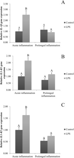 The expression of IL1β was stimulated (p < 0.05) by a single injection of LPS (Figure 1A). Moreover, the expression of mRNA for both types of IL-1 receptors (IL1R1 and IL1R2) is increased during an acute inflammation (Figure 1B,C). On the other side, a sevenfold injection of endotoxin caused no effect on IL1β mRNA expression (Figure 1A). There is also no difference in IL1R1 and IL1R2 gene expression during prolonged stress compared to the control group (Figure 1B,C).