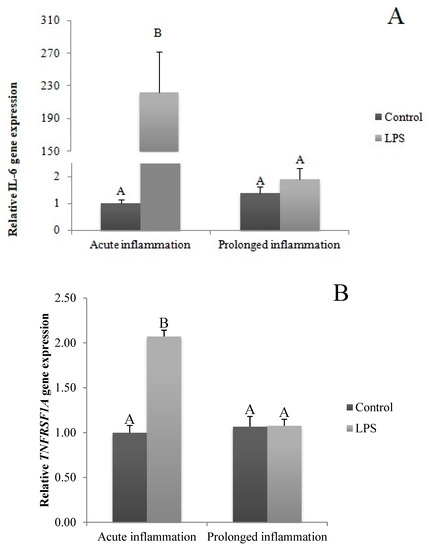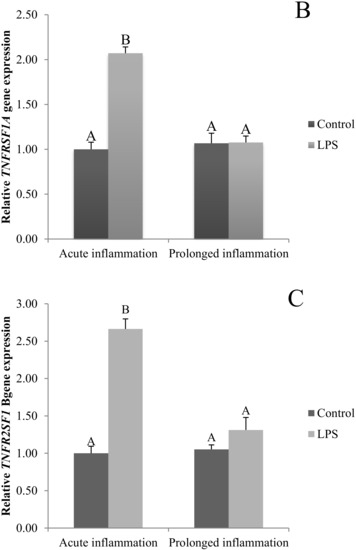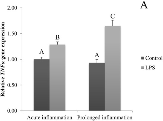 The TNFα gene expression was stimulated (p < 0.05) during an acute inflammation (Figure 3A). Both TNF receptors (TNFRSF1A and TNFRSF1B) gene expression was enhanced (p < 0.05) also by a single endotoxin injection (Figure 3B,C). Sevenfold administration of an inflammatory factor enhanced (p < 0.05) TNFα gene expression (Figure 3A). Furthermore, this expression is stronger (p < 0.05) even in comparison to TNFα gene expression in the acute inflammation group. There is no effect of prolonged inflammation on TNFRSF1A (Figure 3B) and TNFRSF1B (Figure 3C) gene expression.