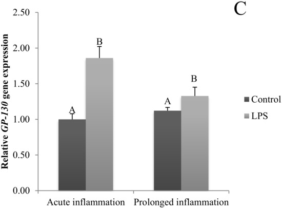 A single LPS injection increased (p < 0.05) IL6 gene expression (Figure 2A). The level of IL6R (Figure 2B) and IL6ST (Figure 2C) mRNA expression was higher (p < 0.05) during an acute inflammation compared to the control group. The prolonged inflammation has no effect on IL6 mRNA expression (Figure 2A). However, a sevenfold LPS injection enhanced (p < 0.05) IL6R (Figure 2B) and IL6ST (Figure 2C) gene expression in comparison to the control group.