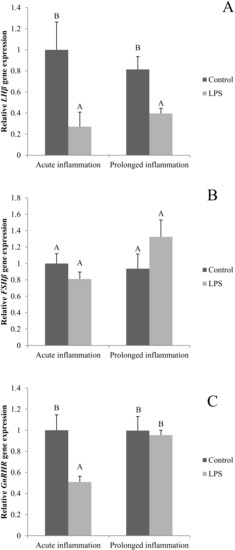 The effects of an acute and prolonged inflammation on the relative LHβ (A) FSHβ (B) and GnRHR (C) mRNA levels in the AP normalized to the average value of three reference genes expression: actin beta (ACTB), glyceraldehyde 3-phosphate dehydrogenase (GAPDH), peptidylprolyl isomerase C (PPIC). The data are presented as a mean value ± S.E.M.; Significantly according to the multiple analysis of variance followed by a Tuckey’s post-hoc test (p < 0.05). AB-bars with different letters vary.