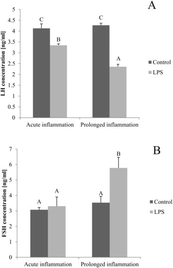 Although inflammation interrupts GnRH/LH regulation, it has been confirmed that LPS injection may elevate the FSH concentration [51]. Our results show that prolonged inflammation caused a higher blood concentration of FSH, which is similar with our previous study in which the stimulatory effect of LPS was observed from the second injection [10].