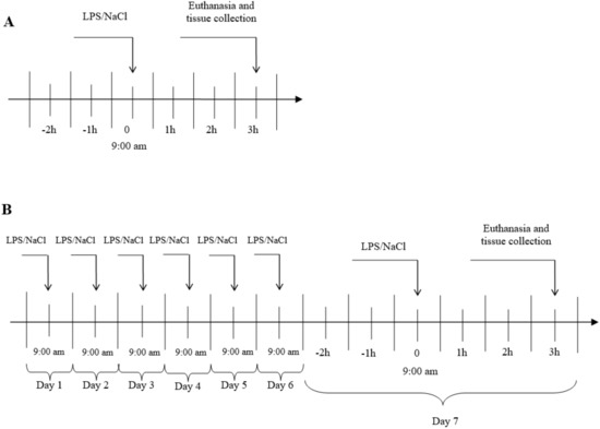 General procedure of experiment. A- Acute inflammation, B- prolonged inflammation, LPS- lipopolisaccaride S from E. coli 055:B5 in 400 ng•kg−1 dose.