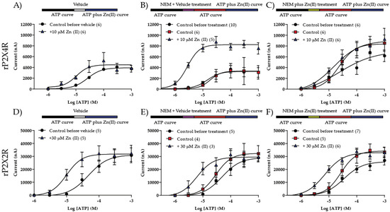 NEM treatment in presence of Zn(II) abolish metal modulation in rP2 × 4R but not on rP2 × 2R. The protocol consist on a full ATP concentration–response curve (black bar in protocols and black filled circles in graphs) followed by a 5 min treatment (vehicle = white, NEM + vehicle = purple, NEM + Zn(II) = yellow) and 20 min washout and finally a full ATP concentration–response curve in absence (red bar in the protocols and red filled squares in graphs) or presence of Zn(II) (blue bar in the protocols and blue filled triangles on graphs). (A) Vehicle treatment on rP2 × 4R, (B) NEM treatment on rP2 × 4R, (C) NEM + Zn(II) treatment on rP2 × 4R, (D) vehicle treatment on rP2 × 2R, (E) NEM treatment on rP2 × 2R and (F) NEM + Zn(II) treatment on rP2 × 2R. Circles, squares and triangles represent ± SEM. N is indicated in parenthesis on each graph.