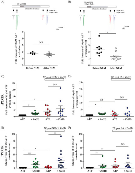Zn(II) potentiation is annulled in rP2 × 4R by NEM + Zn(II) and IA + Zn(II) treatments but only with IA + Zn(II) treatment in rP2 × 2R. (A) representative traces (up) of ATP-evoked currents in absence (black) and presence of Zn(II) (Green) and after NEM treatment (red and blue) and quantification of the fold increase of ATP-evoked currents by Zn(II) (down). (B) representative traces (up) of ATP-evoked currents in absence (black) and presence of Zn(II) (Green) and after NEM + Zn(II) treatment (red and blue) and quantification of the fold increase of ATP-evoked currents by Zn(II) (down). * p < 0.05, NS = non significative according to the Mann–Whitney test. (C,D) quantification of the fold increase of first ATP evoked current in NEM + Zn(II) and IA + Zn(II) treatments in rP2 × 4R and (E,F) quantification of the fold increase of first ATP evoked current in NEM + Zn(II) and IA + Zn(II) treatments in rP2 × 2R. * p < 0.05, ** p < 0.01, *** p < 0.001 and NS = non significative according to the Kruskal–Wallis test.