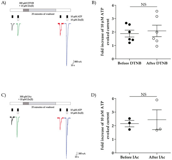 We next replaced NEM for 300 µM 5,5’-dithiobis-(2-nitrobenzoic) acid (DTNB, MW: 396 g/mol) plus 10 µM Zn(II) or by 300 µM iodoacetate (IAc, 186 g/mol) plus 10 µM Zn(II) treatments. The observed results showed that neither of the reagents blocked the P2 × 4R Zn(II)-induced potentiation (2.1 ± 0.4 v/s 1.9 ± 0.3-fold, after v/s before DTNB treatment, respectively, p = 0.93, n = 6; 2.4 ± 0.7 v/s 2.2 ± 0.2-fold, after v/s before IAc treatment, respectively, p = 0.75, n = 3; Figure 3), confirming that not only the alkylator size but also the charge is determinant to annul the Zn(II) potentiation. As a proof of concept and in support of the advantage of the short protocol, we performed a complete concentration–response curve by treating oocytes with 300 µM DTNB + 10 µM Zn(II) followed by washout and a new concentration–response curve in the presence of Zn(II). The resultant EC50 was not different from the control (79.8 ± 64.4 v/s 50.3 ± 16.0 µM; p = 0.35, n = 3), but it was consistently reduced in presence of Zn(II) (50.3 ± 16.0 v/s 10.23 ± 5.2 µM, Control v/s 10 µM Zn(II), respectively, p = 0.05, n = 3; Figure S3). Neither the nH nor the Imax was modified by treatments. In sum, contrary to expectations, neither DTNB nor IAc modified the Zn(II)-induced modulation, allowing us to conclude that because of reagent negative charge, neither DTNB or IAc accessed the head receptor domain free thiol site.