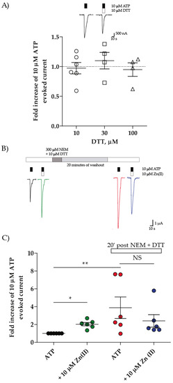 2.3. DTT Did Not Potentiate ATP-Evoked Currents but Abrogated the NEM Effect on the Zn(II)-Induced Potentiation