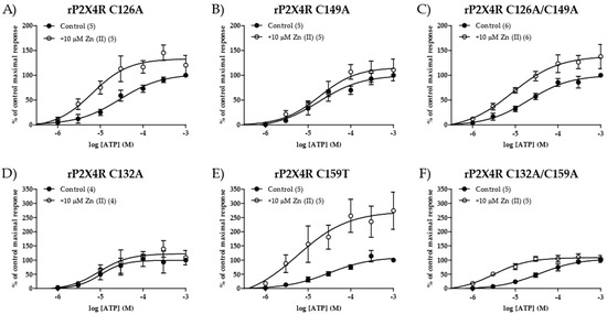 Cysteine residues 132 and 149 are relevant for the Zn(II)-induced positive allosteric modulation of rP2 × 4R. Single and double mutants for the SS2 (upper panel) and SS3 (down panel). (A,B) SS2 single mutants C126A and C149A concentration–response curves in absence (black) and presence (white) of 10 µM Zn(II). (D,E) SS3 single mutants C132A and C159T concentration–response curves in absence (black) and presence (white) of 10 µM Zn(II). (C,F) C126A/C149A and C132A/C159A double mutants concentration–response curves in absence (black) and presence (white) of 10 µM Zn(II). Number of experiments with each mutant are shown in parenthesis for concentration–response protocols. Symbols represent mean values, and bars S.E.M.