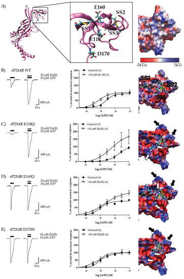 The finding that only non-charged thiol alkylators annulled the P2 × 4R Zn(II)-induced potentiation suggested that the access to the head receptor domain is dependent on negatively charged P2 × 4R residues. We inferred a negatively charged microenvironment in the immediate SS2/SS3 neighborhood necessary for Zn(II) access to this site. To ascertain the verisimilitude of this hypothesis, we modeled the P2 × 4R based on the Danio rerio 3I5D structure [27] and analyzed the electrostatic potential of the head receptor domain with the adaptative Poisson–Boltzmann solver (APBS). Results indicate that the SS1, SS2, and SS3 surroundings have a negative electrostatic potential (Figure S5); in contrast, the orthosteric ATP site, showed a positive electrostatic potential, compatible with the triphosphate ATP moiety. We favored the use of the current spatial structural model because it lacks the SS4 and SS5 compared to other tridimensional resolutions [37]. To identify whether acid residues located near the P2 × 4R head domain are relevant to determine a negative electrostatic potential to attract a divalent metal, we examined the influence of acid residues E118 and E160 in the SS2/SS3 vicinity (Figure 6A); the role of these acids had not been evaluated before. As a strategy to cause a minimal volume perturbation in the head receptor domain, in-silico mutations of these acid residues were replaced by the respective amides (i.e., E by Q and D by N) as in mutants E118Q, E160Q. In addition, D170N was preferred over D170A since the latter did not abolish the Zn(II)-induced ATP-evoked currents potentiation [38]. The electrostatic potential of the WT receptor and mutants is visually shown in a color-graded scale from −5 kT/e (red, negative potential) to 5kT/e (blue, positive potential).