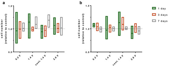 Cell number of osteoblasts cultured one, three, and seven days with and without electrical stimulation counted via ImageJ. Cell number is displayed relative to the control for each time point. For this experiment, 0.2V, 1.4 V, and 2.8 V groups were stimulated 3 × 45 min per day while the cont. 1.4 V group was stimulated continuously with 1.4 V. Cells grown on Ti6Al4V electrodes (a) and collagen-coated coverslips (b). n = 3.