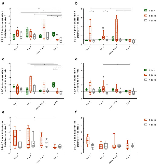 Cells growing on coverslips showed less change in the gene expression of COL1A1, ALP, and BGLAP after ES compared to cells growing on electrodes. COL1A1 expression was increased after three days for ES with 0.2 V, 1.4 V, and continuous 1.4 V. Thereby, the increase after three days of stimulation with 1.4 V was significant (p = 0.0078). Furthermore, the decrease of the COL1A1 expression from three to seven days was significant for 0.2 V and 1.4 V (p = 0.0369, p = 0.0218, respectively). Cells grown under ES with 2.8 V for three days expressed significantly less COL1A1 compared to cells with 0.2 V (p = 0.0319) and continuous 1.4 V (p = 0.0386) (Figure b). As for the electrodes, cells growing on coverslips showed a similar expression behaviour of ALP and COL1A1. ES with 1.4 V led to a significant increase in ALP expression after three days compared to the unstimulated control (p = 0.0319) and the stimulation with 2.8 V (p = 0.0155). As for COL1A1, the expression of ALP decreases under ES with 2.8 V with time. Furthermore, a stimulation with continuous 1.4 V led to decreased ALP expression after seven days (p = 0.0313) (Figure 3d). No significant change of BGLAP expression could be observed for the cultivation under electrical stimulation (Figure 3f).