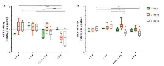 The alkaline phosphatase (ALP) activity from cells growing on electrodes was significantly elevated after their exposure to 0.2 V, 1.4 V, and continuous 1.4 V compared to 2.8 V (p = 0.0004, p = 0.0003, p = 0.0002, respectively) (Figure 5a). After seven days of stimulation, this trend was continued for 0.2 V and 1.4 V compared to 2.8 V (p = 0.0002, p = 0.0005, respectively). Seven days after exposure to 1.4 V continuous stimulation, the ALP activity decreased significantly (p = 0.0313). Further, ES with 2.8 V reduced the ALP activity on the electrodes significantly after three days (p = 0.0313) and non-significantly after seven days.