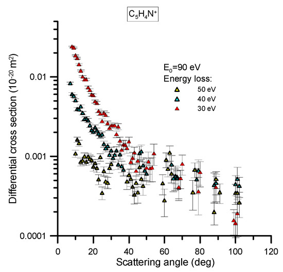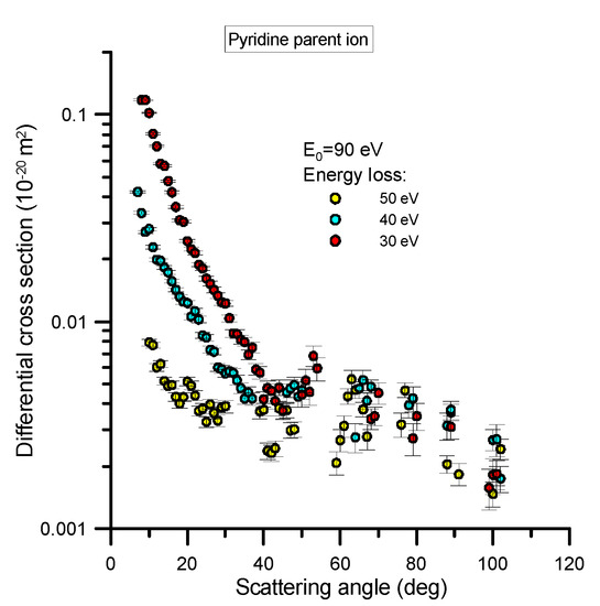 The differential cross section (DCS) to ionize pyridine has been measured, with a reaction microscope, for 90 eV electron impact energy and different energy loss values, namely 50, 40 and 30 eV. The relevant experimental apparatus was designed and constructed at the MPIK institute [8] and has been recently used to investigate the behavior of different biomolecules [9,10]. The details of this experimental system have been published in these previous studies (see [9,10] and references therein), but will be briefly reiterated in Section 4.1.2. This apparatus allows for measurements in coincidence, to provide information about the angular and energy distribution of all the particles involved in the reaction (scattered electron, secondary ejected electron and recoil ion) as well as the fragmentation induced to the target species. However, for the modelling procedure we are presenting later we will only focus on the angular and energy distribution of the scattered electrons and the production of the most representative ions. Specifically, we measured this angular distribution for fixed values (30, 40 and 50 eV) of the energy transferred from the incident electron to the target molecule, and for the most probable ionization channels at the present incident energy (90 eV), which were found to be for parent ion generation (C5H5N+) and the H-loss fragment ion production (C5H4N+). The results of these particular measurements are shown in Figure 2 and Figure 3, with their statistical uncertainty limits also being shown.