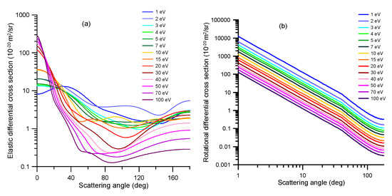 After any scattering event, either elastic or inelastic, for transport simulation programs, based on event-by-event Monte Carlo procedures [4], the angular distribution of the scattered electrons has to be sampled. For this purpose, in the case of the elastic processes, we simply use as the angular distribution functions our normalized elastic differential cross sections, as a function of the scattering angle, calculated with our R-matrix (for 0–10 eV) and IAM-SCAR (from 10 to 100 eV) methods. These calculated DCS, for representative impact energies, are shown in Figure 6a. Similarly, the present dipole-Born DCS calculation is used to determine the angular distribution function for the rotational excitation processes (see Figure 6b). As this figure shows, dipole-Born DCS calculations yield identically shaped curves that simply decrease in magnitude as 1/E.