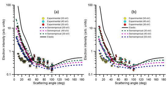 Comparison between the angular distributions given by the semi-empirical formulae (Equation (1) or (2)) for energy losses of 0 (elastic + rotational), 30, 40, and 50 eV, and those measured with the present reaction microscope for a 90 eV electron incident energy. (a) Using our previous semi-empirical formula (Equation (1)) and (b) using the present improved formula (Equation (2)) which is used to extrapolate to other energy losses.