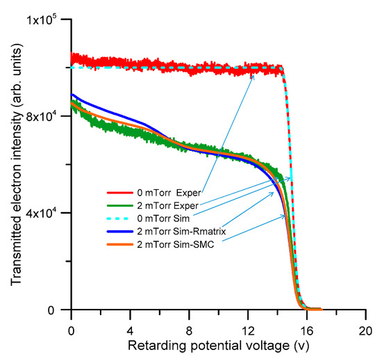 The complete set of consistent cross section data, presented in the previous section, is now used to simulate the electron transport through a gas cell containing pyridine, under intense magnetic field confinement conditions. Details on the experimental conditions and procedures will be given in the next section. Basically, a linear electron beam, generated by an emitting filament, is accelerated along the axis of a cylindrical chamber where it is guided by a uniform axial magnetic field and into that chamber a constant well-defined pressure of gaseous pyridine is introduced through a leak valve. The applied magnetic field is sufficiently intense (around 0.1 T) to confine the gyro-motion of the electron beam into a gyro-radius of a few microns, which is therefore negligible in comparison with the electron beam radius that is defined by the entrance and exit apertures of the chamber (each being 1.5 mm in diameter). Under these conditions, in any collision event the scattering angle is converted into a decrement of the parallel (axial) component of the velocity, which in turn represents a kinetic energy loss in the parallel direction, which can be measured with a potential barrier applied in front of an electron multiplier detector, i.e., with a retarding potential analyzer (RPA). The measured electron intensity distribution of the parallel kinetic energy, for a 15 eV electron beam generated in these experimental conditions, is plotted in Figure 9 together with the corresponding intensity distribution when a gas pressure of 2 mTorr of pyridine is introduced into the scattering chamber. The corresponding electron intensity distributions simulated with our Low Energy Particle Track Simulation (LEPTS) procedure [4,13] are also plotted in Figure 9. LEPTS is an event by event Monte Carlo simulation code which, according to the above integral cross section data set and the angular and energy-loss distribution functions, is sampling when a collision event is taking place and the type of interaction corresponding to this event as well as the energy transferred to the molecular target, the secondary particles generated and the scattering angle corresponding to both the primary and secondary electrons. Under the magnetic confinement conditions used in this experiment, the scattering angle distribution function is crucial to define the energy distribution along the magnetic axis. We can say that this particular configuration is especially suitable to evaluate the efficacy of the input DCS data used in the simulation.