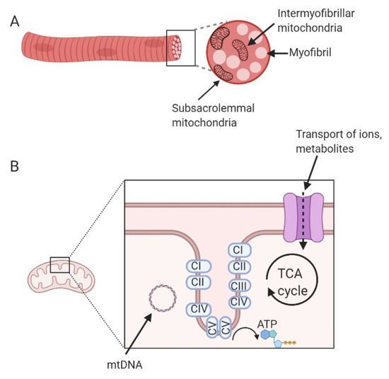 (A) Location of mitochondria within the skeletal muscle fibre. (B) Location of metabolic processes within the mitochondria. Black boxes indicate a section of each figure that has been magnified in the right-hand image. Created with BioRender.com.