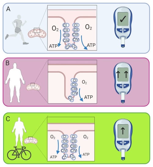 (A) Fit, healthy individuals have increased mitochondrial respiratory function and are insulin sensitive. (B) Patients with insulin resistance and type 2 diabetes (T2D) have comparatively lower mitochondrial respiratory function and are insulin resistant. (C) Patients with insulin resistance and T2D who are able to increase their physical activity see an improvement in mitochondrial respiratory function and a reduction in insulin resistance. Glucometer represents the degree of insulin sensitivity, and associated changes in blood glucose concentration. In panel (A), the glucometer shows blood glucose in the normal range, and fit, healthy people have normal insulin sensitivity. In panel (B) the glucometer shows the increased blood glucose concentrations present in people with insulin resistance, which are improved with exercise training (panel C). Created with BioRender.com.