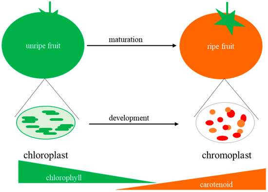 Leaves are the major site of photosynthesis for most plants, however, developing fleshy fruits are capable of photosynthesis, and it is estimated that up to 20% of the total fruit carbohydrate comes from the photosynthesis of immature fleshy fruits in tomato [9], the model plant for fleshy fruits. In addition to photosynthesis, during fruit maturation, chloroplasts develop into chromoplasts, synthesizing nutritional metabolites, such as carotenoids (Figure 1) [10]. The transition from chloroplast to chromoplast is often happened in flowers and fruits, but only a few plant species differentiate chromoplasts in leaves [11,12]. During chloroplast to chromoplast transition, besides the remodeling of the internal plastid structures, the most prominent changes are a degradation of photosynthetic competence and over-accumulation of carotenoid pigments, as it was well reviewed by Egea et al. [13]. Therefore, the manipulation of chloroplast to chromoplast differentiation in plants appears as a very promising strategy for improving the nutritional and health benefits of crops [14,15]. On the other hand, it has been demonstrated that tomato fruits with more active chloroplasts at the premature stage will develop more active chromoplasts at the mature stage [16]. Therefore, enhancing fruit chloroplast development can result in higher nutritional value in mature fleshy fruit [17,18,19].