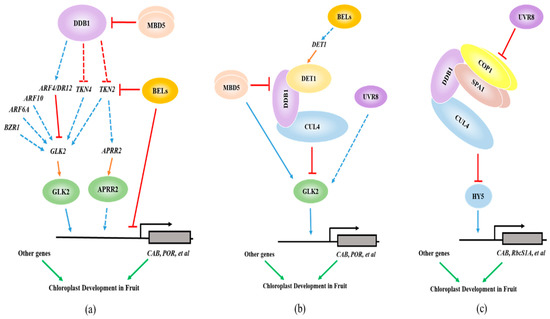 Additional layers of controls on the transcription factors GLK2 and HY5 occur through post-translational regulation via the CUL4-DDB1-DET1 and COP1-SPA1-DDB1-CUL4 ubiquitin ligase complexes, respectively (Figure 2b,c). MBD5 interacts with the CUL4-DDB1-DET1 complex and inhibits its regulatory function on GLK2. Additionally, MBD5 directly interacts with GLK2 to inhibit its degradation. BEL11 enhances the transcription of DET1, thus leading to formation of the CUL4-DDB1-DET1 complex. UVR8 also plays a role in accumulating GLK2 protein under UV-B illumination through post-translational regulation. UVR8 interacts with the COP1-SPA complex(es) that interferes with the degradation of HY5. In addition, LOL1 represses chloroplast development in fruit through uncertain mechanisms. ARF10 directly targets the GLK1 promoter and transcriptionally activates the expression of GLK1 in tomato fruit, increasing the chlorophyll content of unripe fruits.