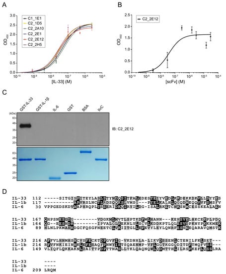 Molecular characterizations of anti-IL-33 single-chain antibody variable fragments (scFvs). Enzyme-linked immunosorbent assay (ELISA)-based affinity determination of anti-IL-33 scFvs. (A) Affinity determination of the top six clones that exhibited high binding signals against IL-33. (B) Affinity determination of the purified C2_2E12, which seems to have the highest binding signal and good protein condition among six clones. Kd values of C1_1E1, C2_1D5, C2_2A10, C2_2E1, C2_2E12, and C2_2H5 were estimated by kinetic analysis. ELISA was repeated three times. (C) Immunoblot analysis of the recombinant proteins using C2_2E12 for primary antibody (0.5 mg·mL−1, 1:100 dilution) and anti-hemagglutinin-horse radish peroxidase (anti-HA-HRP) for secondary antibody (0.2 mg·mL−1, 1:5000 dilution). Expression of recombinant interleukin cytokines (GST-IL-33, GST-IL1β, and GST-IL6) and unrelated proteins (GST, BSA, and IlvC) in E. coli BL21 (DE3) as revealed by SDS-PAGE analysis. IB, immunoblot. (D) Multiple protein sequence alignment of IL-33, IL1β, and IL6. BSA: bovine serum albumin, IL: interleukin.