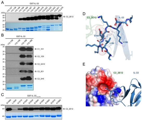 Epitope mapping of C2_2E12. (A) Immunoblot analysis of 14 GST-IL-33 deletion mutants to map the IL-33 epitope at secondary structural element level for scFv clone C2_2E12. Residue numbers of the mutants are shown. (B) Immunoblot analysis of four GST-IL-33 deletion mutants to map the IL-33 epitopes for scFv clones C1_1E1, C2_1D5, C2_2A10, C2_2E1, and C2_2H5. (C) Immunoblot analysis of alanine scanning for GST-IL-33149-158 for recognition by the scFv clone C2_2E12. Residue numbers and identities are shown. In panels (A) through (C), Coomassie Blue stained gel is shown at the bottom. Amount of the loaded protein per lane was 1 μg. The scFv clones were used as the primary antibody (0.5 mg·mL−1, 1:100 dilution), and anti-HA-HRP was used as the secondary antibody (0.2 mg·mL−1, 1:5000 dilution). (D,E) The HADDOCK-derived molecular docking of C2_2E12 (green) to IL-33 (PDB: 4KC3, blue) complex. A homology structural model for C2_2E12 was generated using SwissModel [24]. Both proteins are depicted as cartoon diagrams. (D) Residues of IL-33 in the epitope region recognized by C2_2E12 are represented as stick models. Dash lines represent van der Waals atomic distances in Å. (E) Electrostatic interactions between C2_2E12 and IL-33. The acidic pocket in C2_2E12 consists of N163, D164, S166, Y168, A218, and Y230. L150 and basic K151, the two key residues in the epitope region of IL-33 are depicted as stick models. The figures in the panels (D) and (E) were generated using PyMOL (Schrödinger).