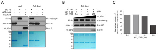 Pull-down assay was performed using Glutathione Sepharose 4B resin (GE Healthcare, Chicago, IL, USA). First, 4 µM of GST-IL-33 was added to the resin and incubated for 30 min at 4 °C with gentle shaking. The resin was washed 4 times with wash buffer C (50 mM Tris-HCl pH = 7.5 and 150 mM NaCl) and incubated for 30 min at 4 °C with gentle shaking upon the addition of 4 µM of ST2-Fc. Subsequently, C2_2E12 at a series of concentrations (0.4, 4, 40, and 400 µM) was added to the resulting resin with further incubation for 30 min at 4 °C. After 4 times of washing, proteins were separated by SDS-PAGE on a 12% gel, stained with Coomassie Brilliant Blue, or transferred onto a PVDF membrane (45 mA for 60 min). Protein bands on the PVDF membrane were visualized by immunoblotting by ECL reaction using anti-ST2 (1:5000 dilution, Abcam, Cambridge, United Kingdom) and mouse anti-rabbit IgG–HRP (1:10000 dilution, Santa Cruz Biotechnology, Dallas, TX, USA), anti-GST-HRP (1:10000 dilution, Santa Cruz Biotechnology, Dallas, TX, USA), and anti-His6–HRP (1:10000 dilution, Santa Cruz Biotechnology, Dallas, TX, USA). Gels were quantified using ImageJ (National Institutes of Health, Bethesda, MD, USA).