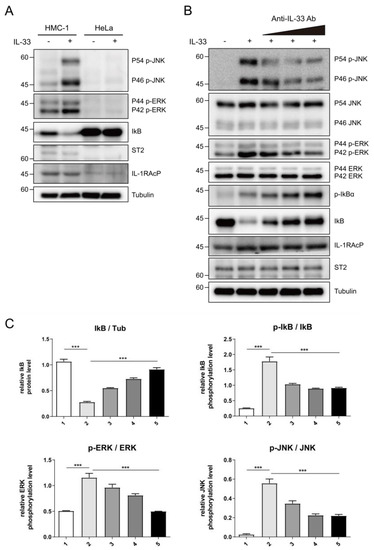 To corroborate the neutralizing effects of C2_2E12 in the IL-33/ST2 signaling axis in cells, we tested IL-33 induced MAPK and NF-κB pathways activation in human mast cells (HMC-1). HMC-1 cells expressed endogenous ST2 receptor and IL-1RAcP co-receptor, unlike HeLa cells (Figure 4A). The levels of phosphorylated extracellular signal-regulated kinase (ERK) and c-Jun N-terminal kinase (JNK) in the MAPK pathway were increased by the IL-33 C208S/C232S:ST2 complex while the level of inhibitor of NF-κB α subunit (IκBα) in the NF-κB pathway was reduced, supporting that IL-33 activates both MAPK and NF-κB pathways (Figure 4A). Subsequently, we treated the HMC-1 cells with IL-33 C208S/C232S alone or pre-incubated with C2_2E12 and analyzed phosphorylation levels of ERK, JNK, and IκBα (Figure 4B,C). The relative phosphorylation level of IκBα is decreased by C2_2E12 in a dose-dependent manner, indicating the suppression of the NF-κB signaling pathway. Relative phosphorylation levels of ERK and JNK were reduced by C2_2E12 in a dose-dependent manner, implicating the suppression of the MAPK pathway. Analysis of the results indicated that C2_2E12 can neutralize IL-33 and ST2 interaction by binding with IL-33 in a dose-dependent manner (Figure 4B,C). Taken together, our results demonstrate that C2_2E12 treatment can reduce IL33/ST2 complex formation by interfering with IL-33 and ST2 binding and thus act as a neutralizing antibody for the suppression of the IL-33/ST2 signaling axis in cells.