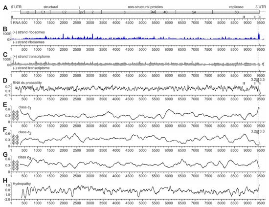 Ribosome profiling of the HCV RNA genome replicating in Huh-7.5 cells. (A) The HCV genome with the polyprotein coding regions for structural and non-structural (NS) proteins. The numbering shows nucleotide numbers of the Jc1 genome []. Two conserved miR-122 target sites in the HCV 5′UTR, sites 5B.2 and 5B.3 in the NS5B coding region, and the 3′UTR target site are shown as small boxes with solid lines, the non-conserved site 5B.1 as a box with dashed line [,]. (B) Ribosome profiling reads of the HCV plus (+) strand ribosomes and (−) strand ribosomes. (C) Transcriptome reads of the HCV plus (+) strand (upper panel) and (−) strand (lower panel). (D) RNA double-strand (ds) probability. miR-122 target sites in the 3′region are indicated. The positions of the stem-loops 5BSL3.2 and 5BSL3.3 are indicated by white and grey arrows, respectively, and dotted and dashed grey lines indicate their position relative to the ribosome peaks at the stop codon. (E–G) The frequencies of RNA secondary structure classes in which opposing codons would be required to pair (as shown in the inserts) were calculated for conserved HCV sequences []. For example, in class c1, position 1 of one codon would be required to pair with position 1 of an opposing codon, whereas in class c2, position 2 of one codon would be required to pair with position 2 of an opposing codon []. Windows of 200 nucleotides (nts) were moved in steps of 5 nts, and for each nucleotide, the means of class frequencies are calculated from all windows containing this given nt. As a result, the plots show if a certain RNA secondary structure class is under-represented due to selection pressure, which would suggest the presence of a functional RNA secondary structure []. Thereby, under-representation of RNA secondary structure class c1 indicates the general importance of codon position 1 to determine a specific amino acid, whereas under-representation of class c2 indicates the importance of codon position 2, which often determines hydrophobic amino acids in membrane standing protein regions []. In (F), the positions of the stem-loops 5BSL3.2 and 5BSL3.3 are indicated as in (D). (H) HCV polyprotein hydropathy plot [], smoothened by plotting hydrophobicity means of sliding windows of 3 amino acids.